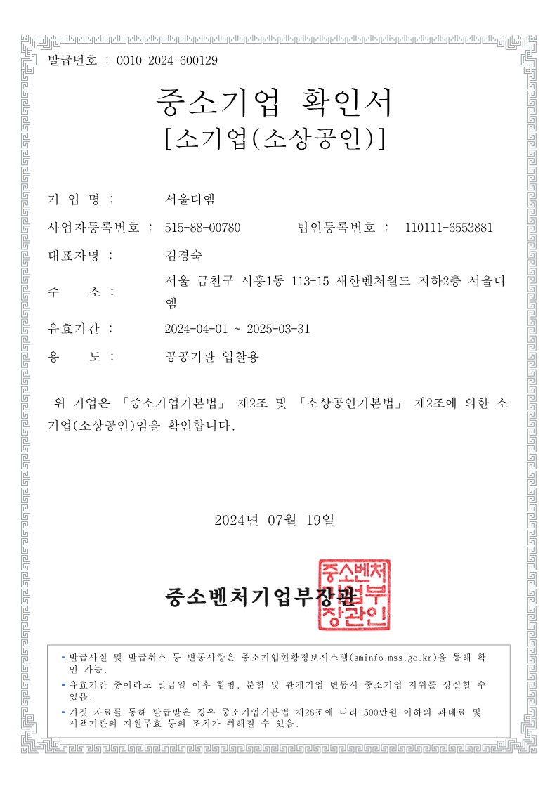 서울디엠(주) 중소기업인증서입니다.(2024년)